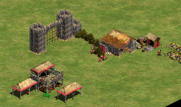 1)小围一下,尽快升级,所谓小围,就是利用磨坊,采矿场,木栅栏,少了的遮挡一下道路,记住一定不能建太多木栅栏,否则升级封建会慢不少。如下图:
