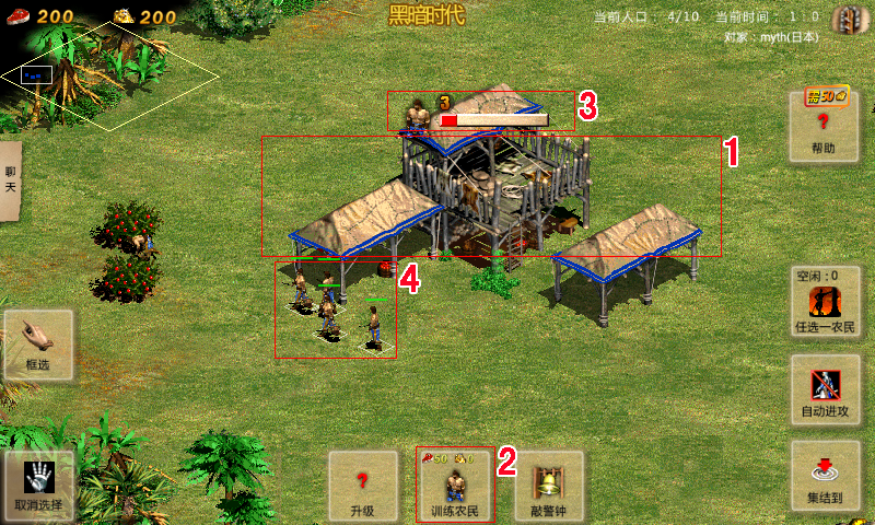 (一)新手操作: 点击城镇中心(如图中的数字1标示,以后数字1都用①代替),点击界面下方的“训练农民”图标②,城镇中心上会出现生产农民的进度条③。等进度条满,默认状态下,新生产出来的农民会出现在城镇中心的周边,如④. (二)高手必看: 生产农民,黑暗时代18秒,封建时代16秒,城堡时代14秒,帝王时代12秒。 注:游戏时间,常速模式时等于实际时间;快速模式时等于1.5倍的实际时间。