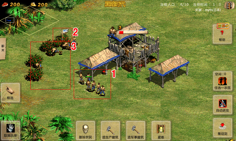(一)新手操作: 1、点击农民①,点击图中灌木丛②,农民就会走向灌木丛开始采集食物(如③)。 2、选中城镇中心,点击一下灌木丛,表示设置集结点到灌木丛,新生产出来的农民会自动去集结点附近采集食物。 注:双击1个农民会选中附近的4个农民。